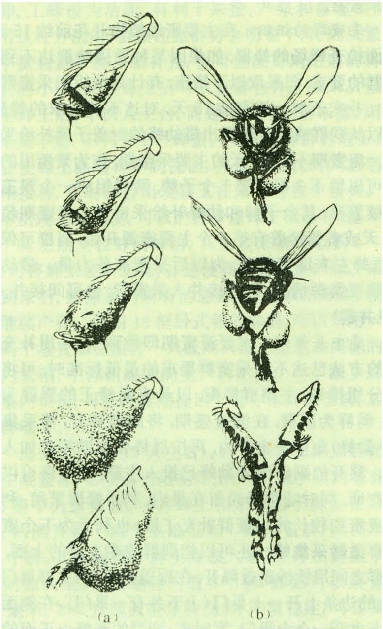 蜜蜂采集花粉,在其形态构造上具有高度的适应性。蜜蜂在采集花粉的过程中,6只足、口器和全身绒毛全部参与采集,协同动作。蜜蜂发现粉源后,便落在花上用喙润湿、舔沾花粉,并用足在雄蕊上采集花粉。采粉蜂在翱翔中,以前足采集头部所粘附的花粉,传给中足;中足也采集胸部和腹面所粘附的花粉,再传给后足的花粉栉上,然后经两后足的花粉栉交互送到相对的花粉耙上聚集,把花粉依次集中在花粉筐的下沿部分,最后经后足的基跗节的曲伸动作,通过耳状突把花粉均分地推挤入左右两后足的花粉筐里,堆积和固定成团状,使两个花粉筐装载重量均衡一致,以便飞行。(图2;彩图18)