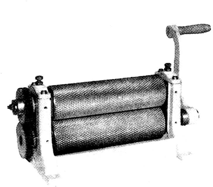 以后,英国、德国、瑞士、苏联等欧洲国家和中国相继生产了多种手摇、电动巢础机。普通巢础机主要由轧花辊筒、传动装置、机座等部件构成,机座附有水盘(见图)。中国制造的意蜂和中蜂巢础机,两个房壁的中心距分别为5.33毫米和4.62毫米,巢房房底夹角120°;辊筒外径意蜂巢础机为86毫米,中蜂巢础机为74.8毫米。
