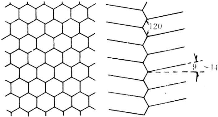 由工蜂分泌蜡鳞筑造的正六棱形房孔。是构成蜂巢的基本单位。分为工蜂房、雄蜂房,此外,还有过渡型巢房和临时筑造的王台。(图1) 图1 具有工蜂房、雄蜂房和王台的巢脾 工蜂房占巢脾的绝大部分,为尖顶的六棱柱形。从巢脾的正面观察,每个巢房均呈正六边形。房底由3个菱形面组成,每一个菱形的钝角约109°,锐角约70°,每两个菱形面的夹角为120°(图2)。
