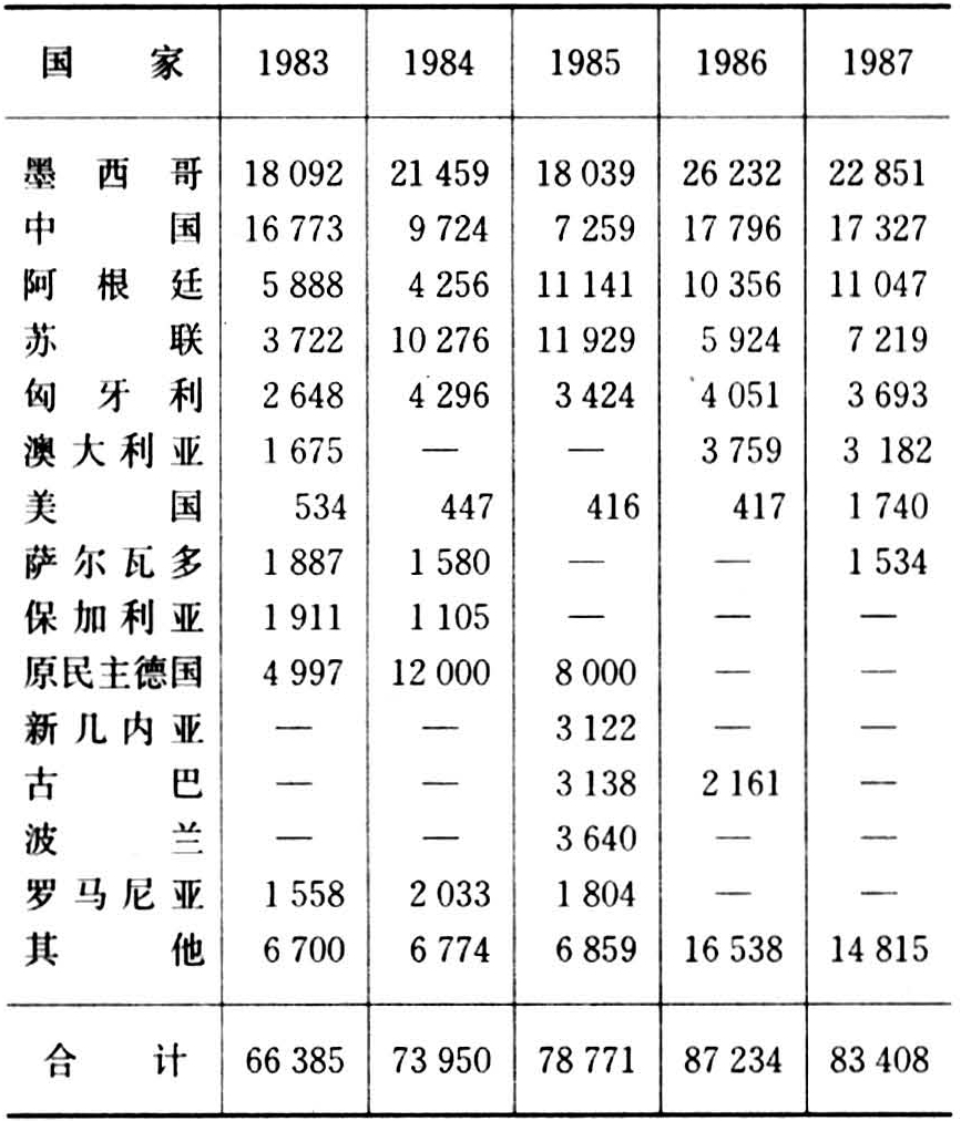 原民主德国每年生产的蜂蜜仅够自己的消费,有时还从苏联进口蜂蜜。原联邦德国每年从其他国家进口七八万吨,并向邻国出口1万余吨,本国消耗8万多吨,1987~1988年人均消费1.4千克,人均蜂蜜消费量居世界第一位。原联邦德国主要从墨西哥、中国、阿根廷、苏联等10余个国家进口蜂蜜(见表)。