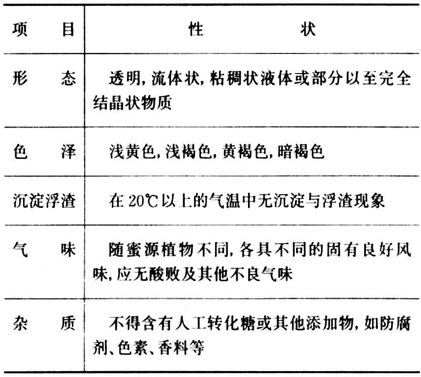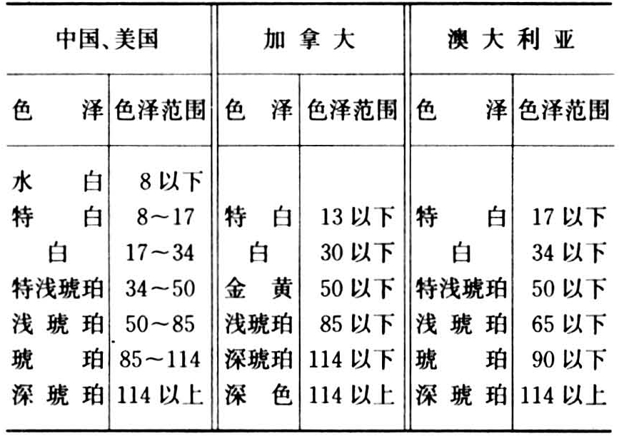 此外,对蜂蜜的色泽也有具体规定。但是,有些国家和地区对蜂蜜的感官指标,不分等级,只制定一般性的要求,如中国台湾省。(表3)