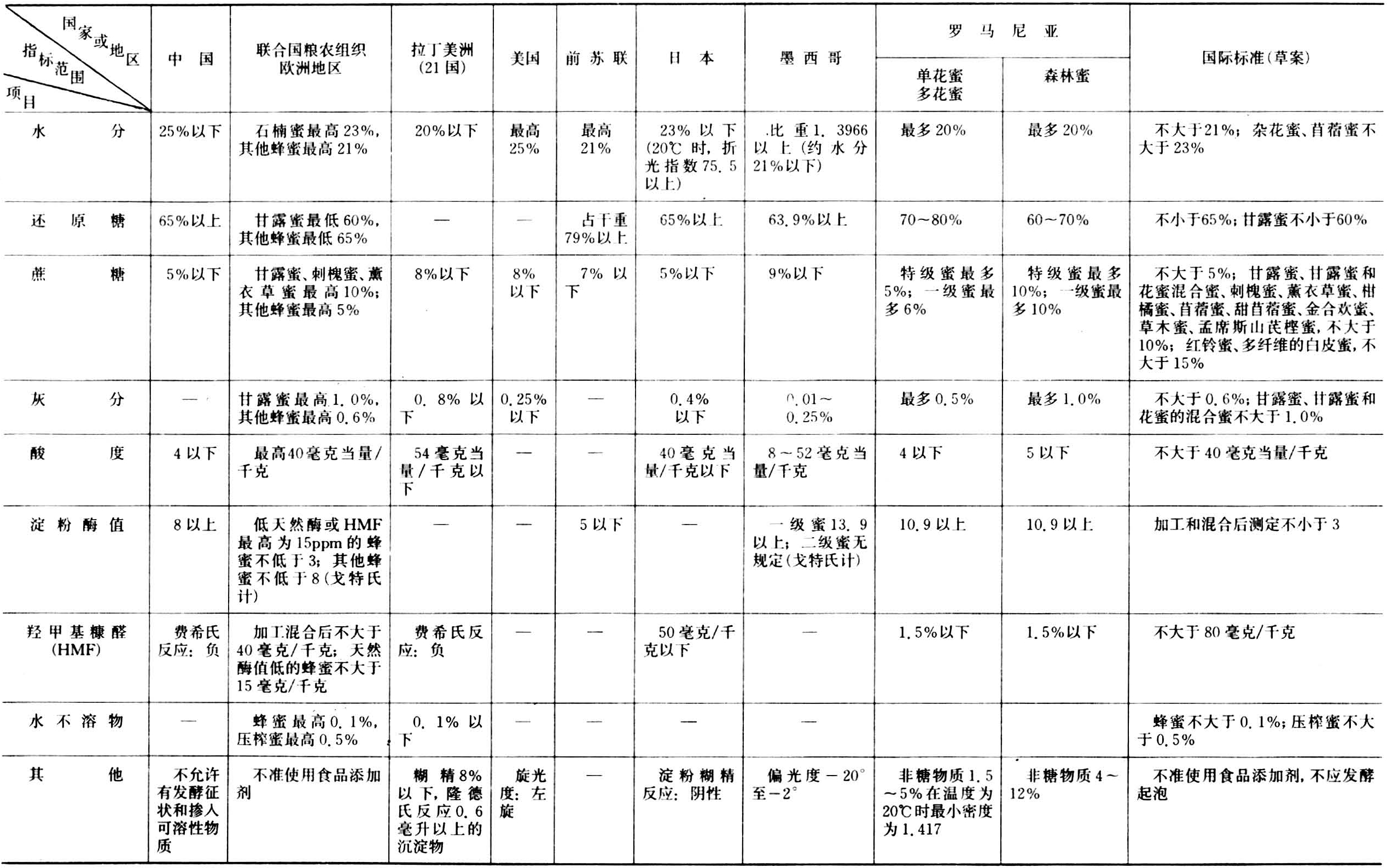 主要包括对水分、还原糖、蔗糖、灰分、酸度、淀粉酶值、羟甲基糠醛(或费希氏反应)、水不溶物的要求以及其他的特殊限制。①水分来源于花蜜,其含量与成熟度、香味、酸度关系密切。含水量越高越容易发酵变质。发酵蜜酸度大,容易腐蚀金属容器,使蜂蜜中金属含量超过允许量。一般要求蜂蜜中的含水量不超过21%,特殊花种(如欧洲的石楠蜜)和个别国家允许的含水量最高为23~25%。②还原糖是蜂蜜的主要成分。一般要求不低于65%。特殊蜜种如甘露蜜、欧洲石楠蜜要求不低于60%。③蜂蜜中的蔗糖,为花蜜蔗糖经蜜蜂唾液转化酶转化后的残留物。成熟的蜂蜜一般含蔗糖1~2%,少数高达10%,甚至15%。多数国家规定最高含量为8%。④淀粉酶值是指1克蜂蜜所含的淀粉酶在40℃下,1小时内转化1%淀粉溶液的毫升数。新鲜蜂蜜的淀粉酶值一般都在8以上。在加热温度过高和时间过长情况下,淀粉酶遭受破坏;长期贮藏,酶的活性也会下降。所以蜂蜜中的淀粉酶值高,表明这种蜂蜜是新鲜的天然蜂蜜。⑤酸度是指中和100克样品蜜加入1N氢氧化钠的毫升数,它是衡量蜂蜜质量的主要标志之一,酸度过大,可能是因水分含量高、长期贮存而发酵引起的。⑥羟甲基糠醛(hydroxymethyl furfural,简称HMF),新鲜蜂蜜含HMF一般不超过10ppm。由于蜂蜜的本身显酸性,经加热或长期贮藏后,蜂蜜中的果糖脱水生成HMF。同样掺入人工转化糖浆也使蜂蜜中HMF含量增加。经过1年以上的贮藏或加热加工其含量超过30~40ppm,甚至达到i00ppm。一般规定含量不超过40ppm(费希氏反应为负),超过150ppm,就可以认为掺入转化糖。HMF含量可反映蜂蜜的新鲜度,判断蜂蜜热加工或掺入转化糖与否的质量指标之一。⑦水不溶物是指细小蜡屑等,一般规定不大于0.1%,压榨蜜不大于0.5%。