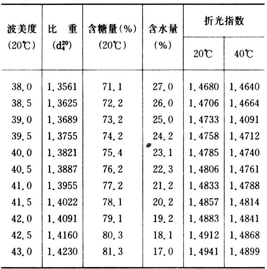 表6 蜂蜜波美度、比重、含糖量、含水量和折光指数对照表