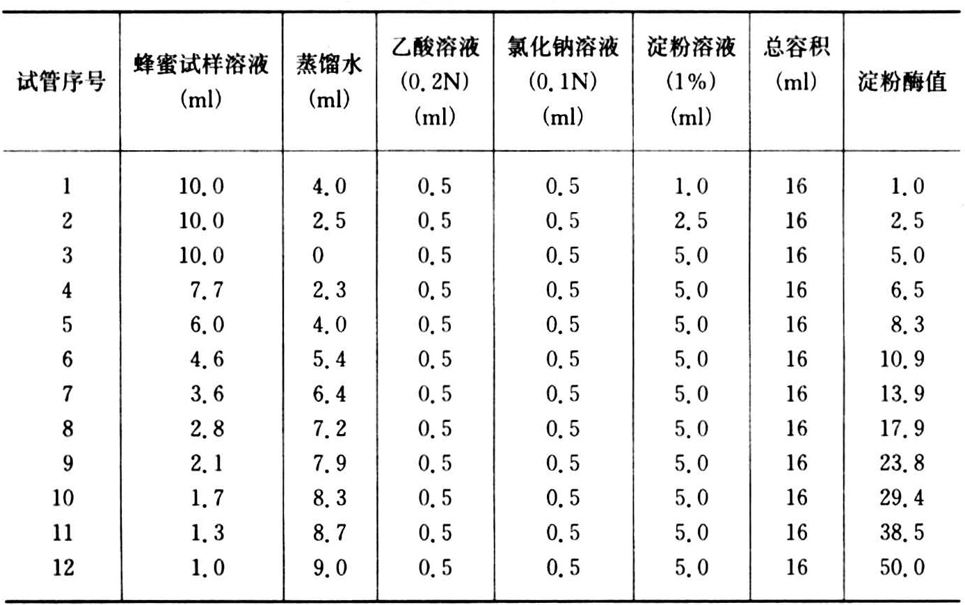 用试管法测定,称取试样10克(精确至0.01克)溶解于50~70毫升蒸馏水中,加入酚酞指示剂2~4滴,再用0.05N氢氧化钠溶液中和,将此液定溶于100毫升的容量瓶中。取大小相同的试管12只,按表7分别加入蜂蜜样液和其他试剂,摇匀后将所有试管同时浸入45~50℃水浴中,使试管液面浸入水浴面下约2.5厘米,在此温度下放置1小时,取出后立即放入冰水中冷却,随即在每个试管中加一滴0.1N的碘溶液,摇匀后立即观察。此时试管的颜色依次由黄色经红色、紫红色、紫色至蓝色,根据紫红色试管号数由表7可查出淀粉酶值,必要时多加一点碘液后观察。淀粉酶值同样可以用分光光度法进行测定。