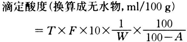理化指标的检验方法,包括:①水分测定。蜂王浆在80℃减压加热至恒重,干燥后,其失重即为水分。②粗蛋白测定。应用凯氏定氮法测定蜂王浆的总氮量,以总氮最乘以6.25即为粗蛋白。③酸度测定。取试样1~2克放入200毫升的三角烧瓶里,加入新沸过冷却的蒸馏水75毫升,使用pH值测量仪,用0.1N氢氧化钠溶液进行滴定到pH3.3止,并按下式计算: