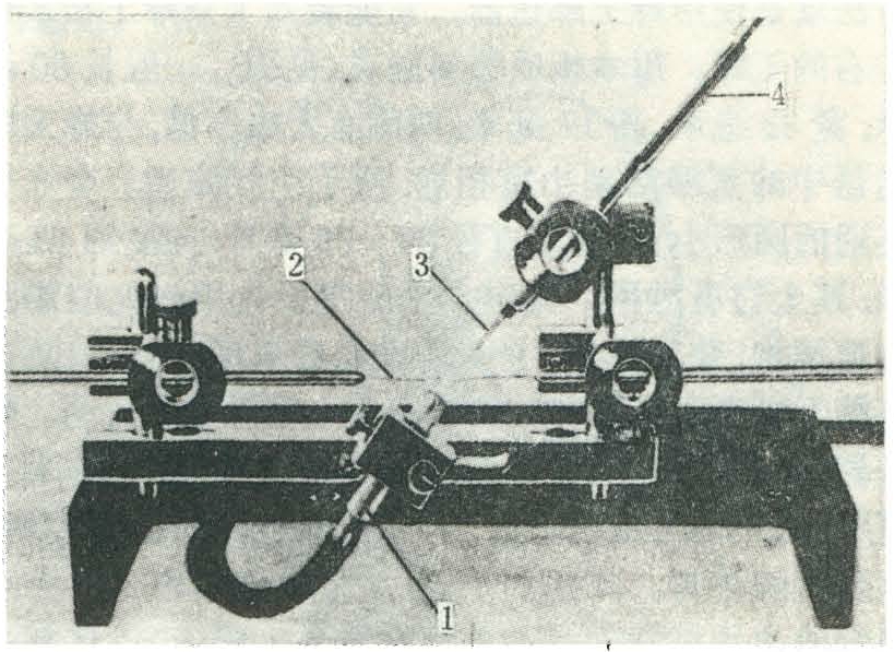 蜂王麻醉室用有机玻璃管或普通玻璃管制成,由一个套管和一根管芯组成。套管内径6.5毫米,上部圆口向内收缩,内径4.5~5.0毫米,可使装入蜂王的腹末端后三节露出。管芯外径6.5毫米,以能插入套管中又不松滑为度。管芯中心孔孔径2.5毫米,接上橡胶管与二氧化碳钢瓶连接。腹钩和背钩(螫针钩)分别夹在两端立柱的操纵器内,可以旋转和进退自如。探针是用来拨开阴道瓣突的。(图2)