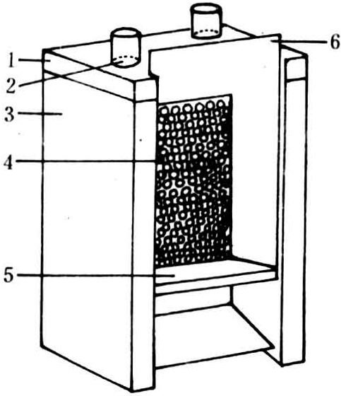 要求环境安静,保持黑暗,空气新鲜。①无王群贮存:采用10框标准箱,关闭巢门,放入1千克工蜂,上盖纱盖,用玻璃酒杯或透明塑料杯将蜂王分别扣在纱盖上。将蜂群放入25~30℃的暗室内,饲喂花粉、水和糖浆。每隔二三十天更换一次工蜂。②用贮王盒贮存:盒用木制或塑料制成,内宽60毫米,深35毫米,高80毫米,前装可抽出的玻璃门,盒上装小型饲料瓶(图2)。在盒内粘一块小巢脾,放入一只蜂王和40~60只工蜂。贮王盒放在黑暗、通风的柜橱内,适宜温度15~17℃,相对湿度50~70%。每二三十天更换一次工蜂。③小继箱贮存:用厚10毫米的木板钉制小继箱,内长80毫米,宽80毫米,高60毫米。两块100×100毫米的方板作底和盖。小继箱内放两个小巢框,一个镶入空脾,一个镶入蜜脾。放入一只蜂王和40~60只工蜂。每隔二三十天更换工蜂时,可将工蜂放入一只新的小继箱内,加在原小继箱上,中间加一张纸,使两箱工蜂自然合并,同时清除死亡工蜂。