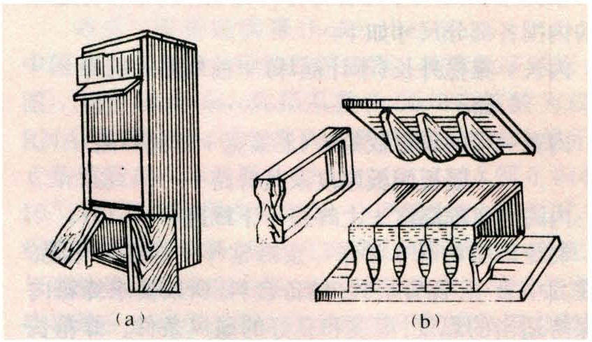 会破坏蜂窝、伤害蜜蜂。(彩图28~32)16世纪至19世纪,随着科学技术的发展,人们用木板制造蜂箱饲养蜜蜂,并持续不断地改进蜂箱的结构。欧洲出现了许多种采用上梁以及采用巢框的木板蜂箱,摆脱了原始型的蜂窝。其中著名的是1814年俄国П.И.普罗科波维奇发明的柜式蜂箱,箱内分层排列着许多木制巢框,蜜蜂在巢框里造脾(图1)。