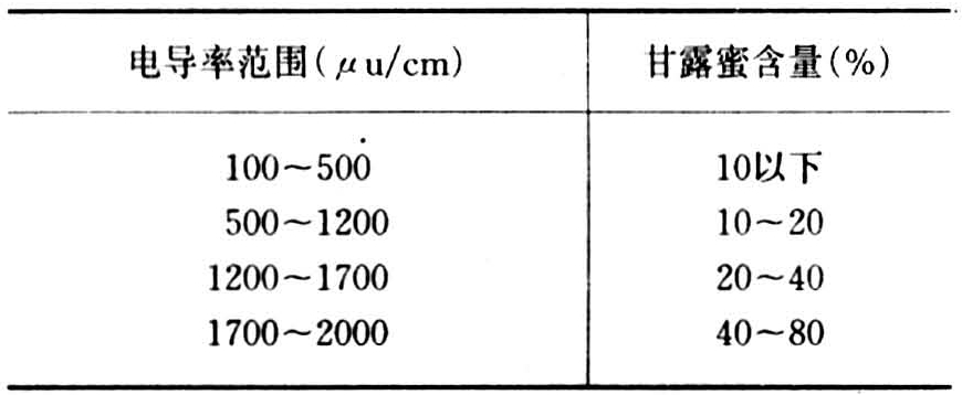 检测甘露蜜一般采用的方法有三种:①电导率检测法。甘露蜜中矿物质的含量б蜂蜜高数倍,电导率也相应增高。可取被测蜂蜜6毫升于小称量瓶内进行电导率测定,若测得电导率在80±20μu/cm以上时,即证明含有甘露蜜(见表)。②氢氧化钙反应法。取蜜样1份,蒸馏水1份,混合均匀,取其稀释液2毫升,加入澄清的饱和石灰水4毫升,摇匀并加热至沸,静置数分钟,如有棕黄色沉淀,证明有甘露蜜。也可以取上述稀释液1毫升,加95%酒精9毫升,充分摇匀,如有混浊现象,亦证明有甘露蜜存在。③醋酸铅反应法。取纯蜂蜜3毫升,加入蒸馏水1毫升,95%的酒精50毫升,混匀,吸取5毫升置于干净试管中,作为对照的标准溶液备用。另取同规格试管,加入待测蜂蜜0.4毫升(如被测蜂蜜已结晶,应隔水加热融化),蒸馏水4.6毫升,混匀,加两滴20%醋酸铅溶液,出现白色絮状沉淀,摇匀,在比色器上与标准试管进行比较。如样液混浊,可逐渐滴入蒸馏水,边滴边摇匀,混浊程度逐渐减弱,直至与标准试管的透明度一致为止,记下滴加蒸馏水的数量。如果加入蒸馏水不超过10滴,则为蜂蜜;如果超过60滴,则被认为是甘露蜜;如加入的水滴在11~60滴时,可以用作蜜蜂部分的越冬饲料,饲喂时须对蜂群饲喂占越冬饲料一半以上的糖浆。