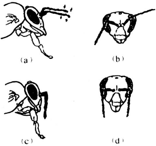 图2 在白天活动时工蜂的头和触角的状态,触角不停地活动(a,b);睡眠时,一对触角下垂,左右平行,表明触角肌肉放松(c,d)(仿Kaiser)