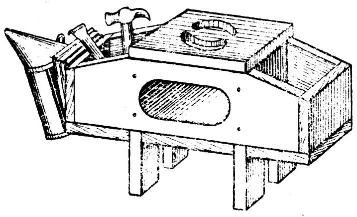 在蜂场工作时使用的能放置各种小蜂具的长方凳(见图)。坐板上开有可提携的小槽;两侧斗内可放置起刮刀、钉锤、蜂刷、割蜜盖刀等工具;斗旁可挂喷烟器;坐板下可存放面网、手套、记录簿、蜂王诱入器等。(林世龙)