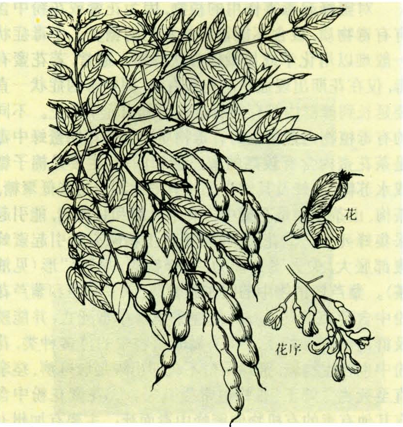 中国北方夏秋季的木本蜜源植物。学名Sophora japonica L.。别名家槐、豆槐、国槐、槐花树。豆科。落叶乔木,高15~25米。奇数羽状复叶互生,小叶9~15枚,叶片卵状短圆形。圆锥花序,顶生,花冠白色,荚果肉质,串珠状。蜜腺位于花冠内子房基部。(见图)