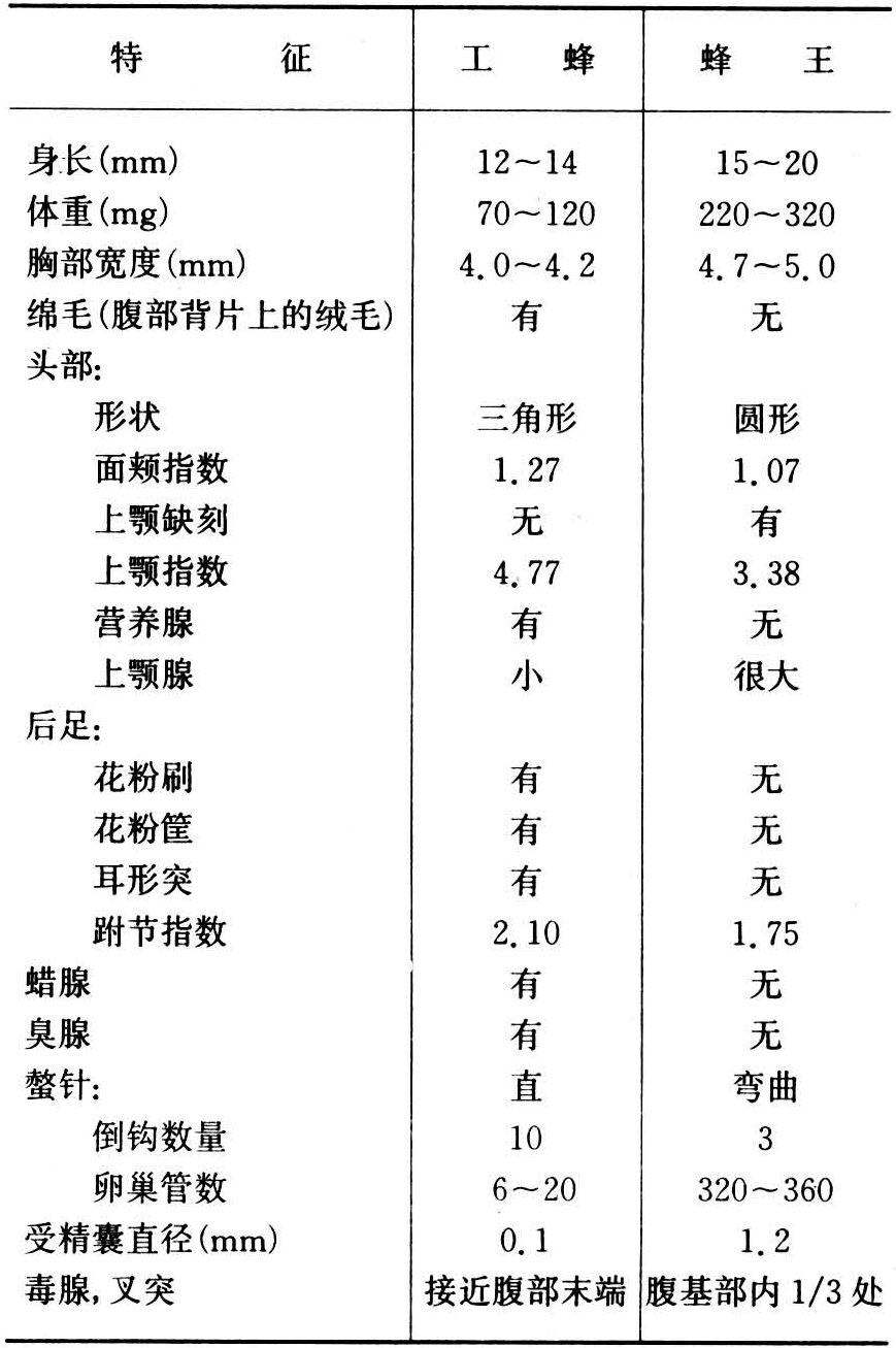 社会性昆虫群体中同一性别但具有不同的形态、身体结构、职能和行为的个体类型。在蜜蜂生物学上的级型是指蜂王和工蜂两种类型。蜜蜂雌性的不同级型,与其主要职能的分工有关,蜂王专司产卵,工蜂负责护理幼虫、供给食物,但无生育能力,二者在身体结构上存在着很大差异(图1)。在表面特征的分析方面,除了测量两者的体长、体重、胸部的宽度以外,还要测量它们的头部形状、上颚和后足的发育以及螫针上的倒钩数量;在对内部器官的分析方面,特别注意卵巢、受精囊以及上颚腺和营养腺的情形。以西方蜜蜂级型为例,其最重要的特征列如表1。可以清楚地看出,这两种级型在生物学功能上有很大差异;蜂王的生殖器官特别发达,而采食器官、泌蜡筑巢器官以及哺育幼虫的器官都不发达,工蜂的状况则相反。两种级型的另一重大差异是寿命,工蜂在夏季只生活约30~50天,冬季可活数月,而蜂王的寿命可长达4~6年。东方蜜蜂两种级型最重要的特征的差异与西方蜜蜂相似,只是数量特征如身长、体重、胸部宽度等相对地较小。