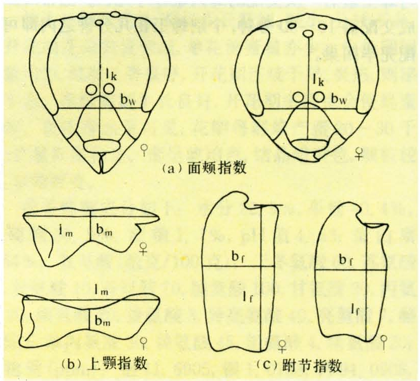 在室内人工培养蜂王时,经常出现中间型;为了便于区分,科技人员在鉴别蜜蜂级型的某些外部形态特征时,时常采用下列三个指数:①面颊指数=面颊长/面颊宽(lk/bw);②上颚指数=上颚长/上颚宽(lm/bm);③跗节指数=跗节长/跗节宽(lf/bf)(见图2)。蜂王的这3个指数均较工蜂的小(见表1)。