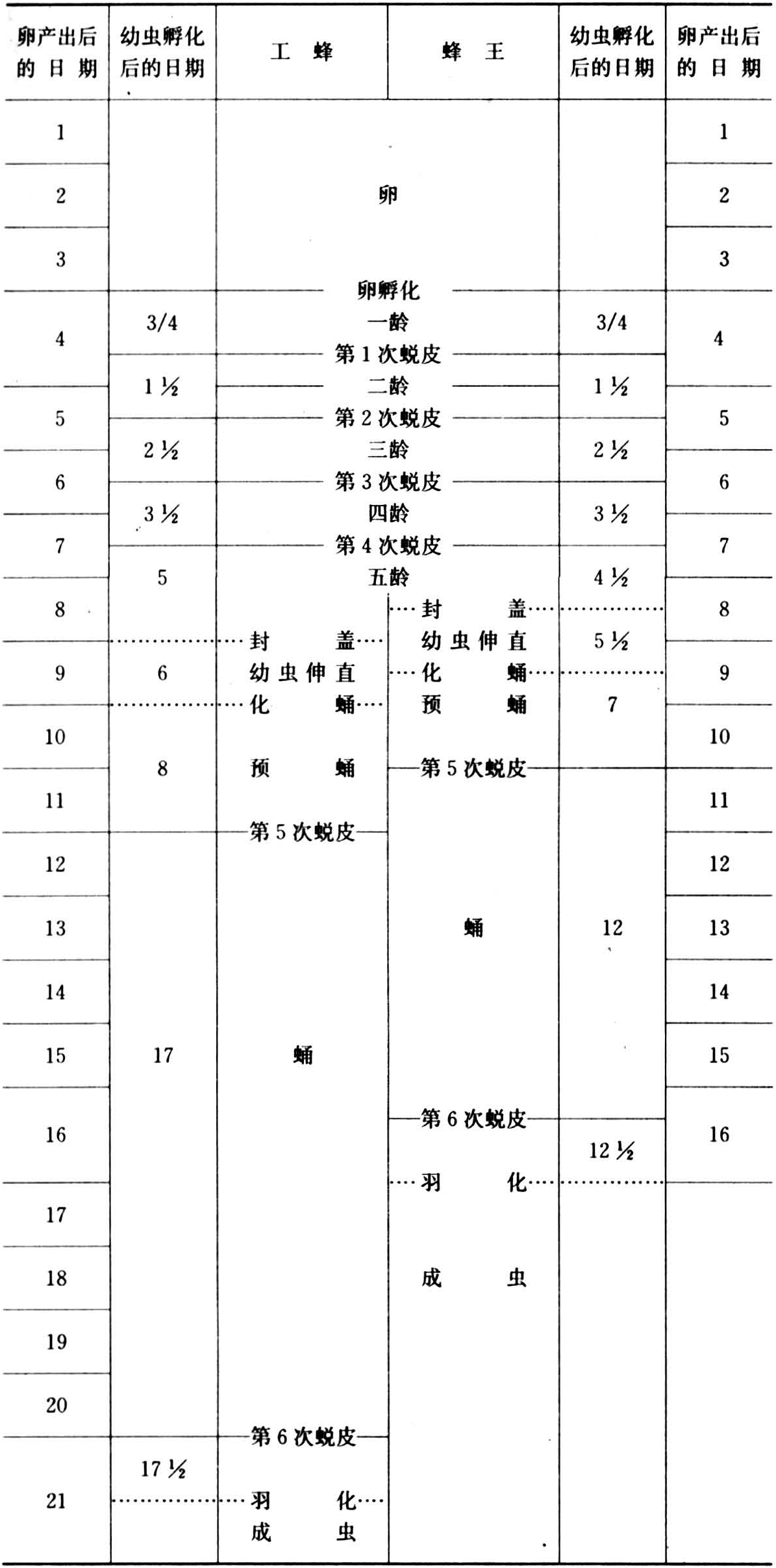 蜜蜂两种级型在发育阶段上的差异也б较明显,表2列出了蜂王和工蜂发育过程的时间顺序。所有幼虫都是在卵产下后的第3天末孵化,工蜂幼虫的巢房在第8天之后被封盖,蜂王幼虫却在7天半之后。蜂王的蛹期大大缩短。体重较大、寿命很长的蜂王从卵到成虫的发育期较短,只需16天,工蜂却推迟到21天才进入成虫期。