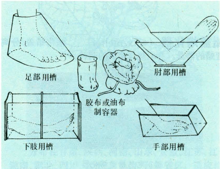 为进行浸蜡治疗,应准备特制的木槽或瓷盆,亦可根据手、足部位不同,用胶布或油布缝制口袋,外面裹以棉套保温(见图)。将融化的蜡液盛放上述浸蜡容器中,凉至65℃;在接受治疗的手、足等部位,先按刷蜡法涂成蜂蜡保护层,再嘱患者连续地浸泡蜡液,直至能耐受蜡温时即可固定浸浴其中。此法能充分发挥蜡疗的各种综合性因子的治疗作用,但不能用于躯干部。