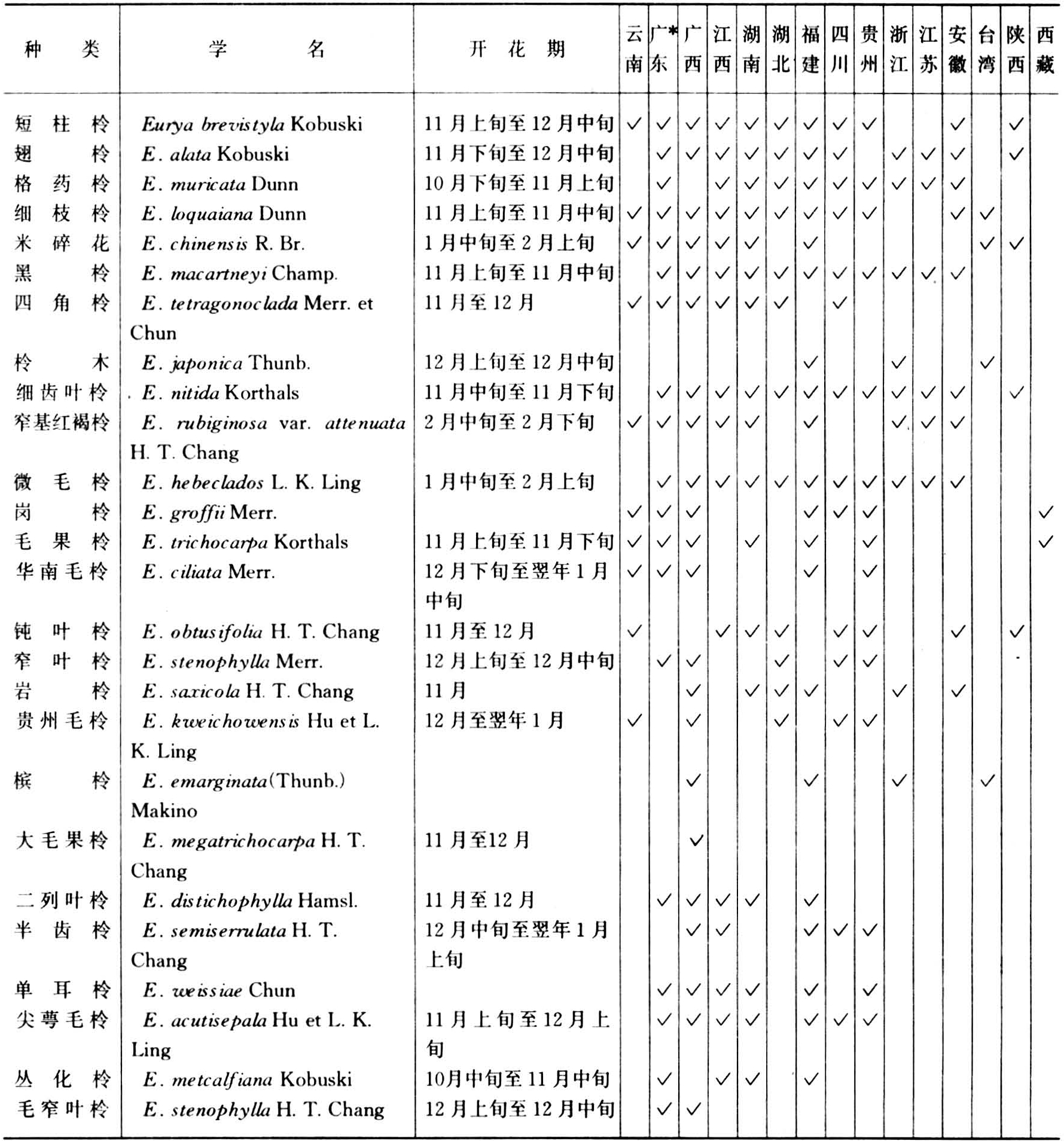 在养蜂生产上价值较大的有格药柃、翅柃、细枝柃、短柱柃、米碎花、微毛柃、四角柃、细齿叶柃、华南毛柃、黑柃等(见表)。柃木在中国分布很广,北至秦岭和淮河,南至海南省,从台湾到西藏广大丘陵山区都有分布;日本、朝鲜亦有分布。柃喜温暖湿润、雨水充足的环境,多生在酸性或中性土壤中,垂直分布大部在海拔2000米以下,少数种类达2600~3000米;在山谷、山坡、灌丛、林缘、路旁、沟边、河岸及疏林下等处都有分布。在湖南、湖北、江西、福建、广东、广西等地一些丘陵山区大量生长,有成片的灌木林,是当地优势树种之一。