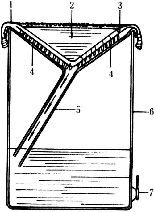 由承接滴蜜的漏斗、圆锥形纱网和滤布构成。适用于小型蜂场。漏斗挂在蜜桶口沿,漏斗的排蜜管斜伸至桶侧壁;圆锥形纱网倒置于漏斗上,与漏斗间距为25毫米,使蜂蜜滴下时不混入气泡。纱网上铺两三层滤布。滤下的蜂蜜滴在漏斗上,经排蜜管导向桶壁,顺桶壁流向桶底,从而避免混入气泡(见图)。也有的将滤布直接蒙在容器上,使滤布呈袋状下垂至距桶底50~70毫米处,并与桶壁保持一定距离。滤蜜时蜂蜜顺袋边周围流注入桶,因袋距桶底距离短,不易混入气泡。