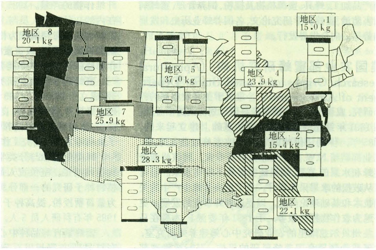 1989年生产蜂蜜7.7万吨,进口蜂蜜3.5万吨,出口蜂蜜4491吨。北方各州以生产蜂蜜为主,蜂蜜单产以蒙大拿州和南达科他州较高,东南各州以培育蜂王、繁殖蜂群和为农作物授粉为主,蜂蜜单产较低(见图)。1974年拥有600群以上的企业养蜂家计4656人,他们生产的蜂蜜约占全国总产量的60%;业余养蜂者平均拥有100群蜂(25~599群),生产的蜂蜜占全国蜂蜜总产量的30%;有蜜蜂25群以下的养蜂爱好者,生产占全国蜂蜜总产量10%的蜂蜜。