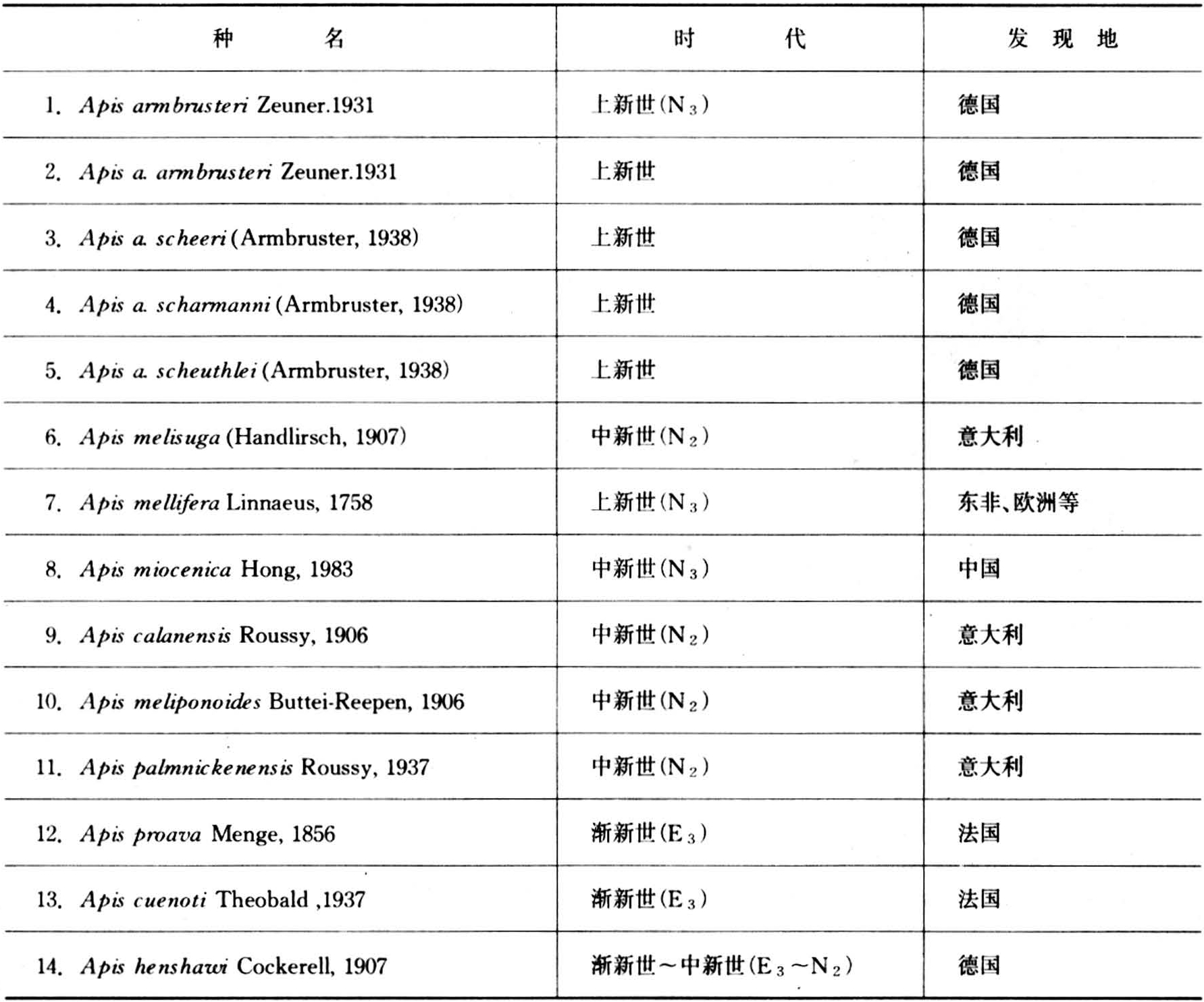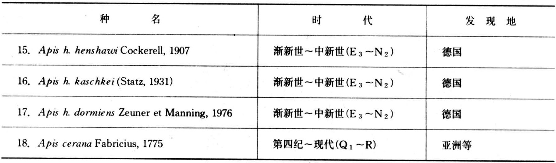 有关蜂化石的记载,首见于中国陶弘景对梁代《名医别录》中的一则注释。他说:“俗有琥珀中有一蜂,形色如生。”但后人无法断定,这就是蜜蜂化石。20世纪以来,德国A.汉德勒斯、美国D.A.科克里尔、德国G.斯塔茨、英国F.E.佐伊纳、英国L.安布鲁斯特、意大利L.鲁西、中国洪友崇、美国T.W.卡利内等人,对已发现的蜜蜂化石进行了研究,共定名蜜蜂属化石已绝灭种9个种和7个亚种,加上两个现生种。详见下页表。表中各种化石,分别分布于古北区(欧亚古陆温带区)、东洋区(热带、亚热带地区)、非洲区(撒哈拉沙漠以南地区)。现生种西方蜜蜂原产于地中海周围地区,现已引入世界各地饲养;东方蜜蜂主要分布于亚洲东南部。中国发现的蜜蜂化石,以北泊子古蜜蜂(Palaeapis beiboziensis Hong)和中新蜜蜂(Apis miocenica Hong)两种化石具有代表性。北泊子古蜜蜂化石是1983年在华北古陆山东莱阳盆地莱阳组中发现的,距今约1.3亿年。它的胫节较细,采集花粉的器官不发育(图1),但从形态特征上看,当属于蜜蜂总科的古昆虫。1983年发现于山东山旺地区、距今2500万年的中新世蜜蜂化石,则与近代生存的蜜蜂类更为接近。该虫虫体中等,褐棕色。头部前伸角圆形横宽;上唇前突,很宽,但稍窄于唇基;复眼大,肾形,单眼保存不清楚;在侧面保存的上唇下方有一棕色斑块,可能为唇基的构造部位。前胸背板窄条状,中胸背板宽大,小盾片较窄,向中央变宽,并微微下垂,与后盾片中沟连接,后盾片窄带状,向中央中沟微徽收缩,两侧明显变窄。足膨大、宽而短,基节较短,为1.5毫米;股节宽扁,长与胫节相差不大或稍短于胫节;胫节稍长于第1跗节,宽大,具密集的毛;其他跗节短,末节变长,有1对爪。腹部第1节与后胸节连接形成并胸腹节,腹部可见6节,每节(腹、背片)矩形,下方有一棕色环带,甚为特殊,第1腹节腹片中央的毛密集,并向两侧呈“八”字形规则散开。