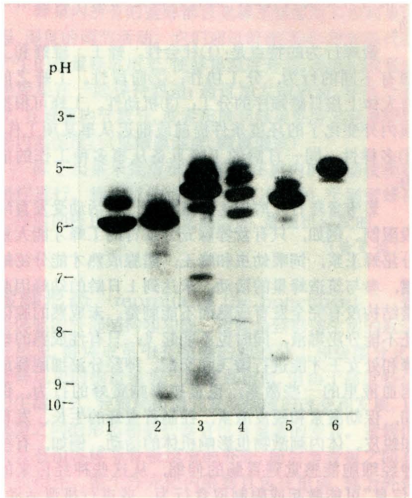 中国蜜蜂研究工作者,1984年用聚丙烯酰胺凝胶等电聚焦电泳,测定了上述6种蜜蜂的酯酶同工酶,发现它们各具自己特有的酶谱。(见图)