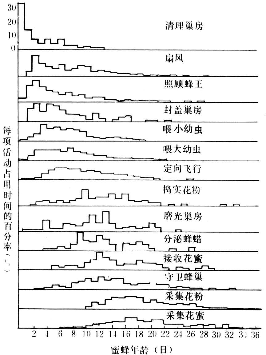 蜜蜂从事各种活动的日龄分布(仿S.F.Sakagami,1953)