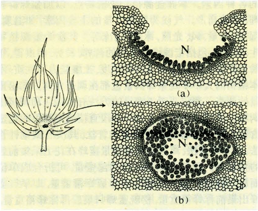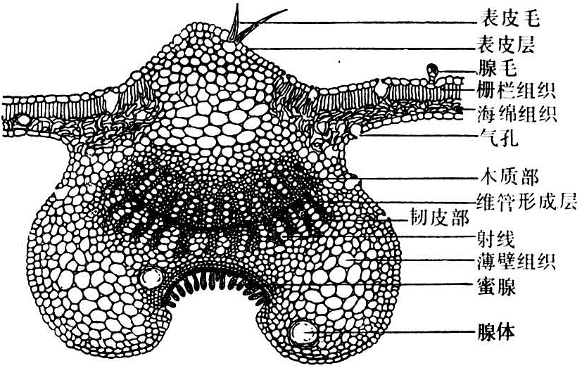 图2 棉花叶片通过主脉上蜜腺的横切面(仿李正理,1979)