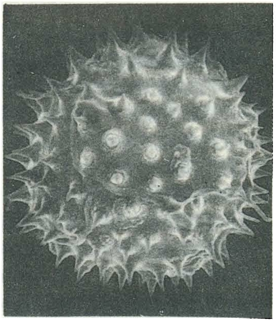 花粉黄色。粒球形。径80.5~120.7微米。具散孔5~8个。外壁具刺状雕纹,高6~8微米,刺距16~19微米,刺顶部光滑,刺基具颗粒状雕纹。(图3)