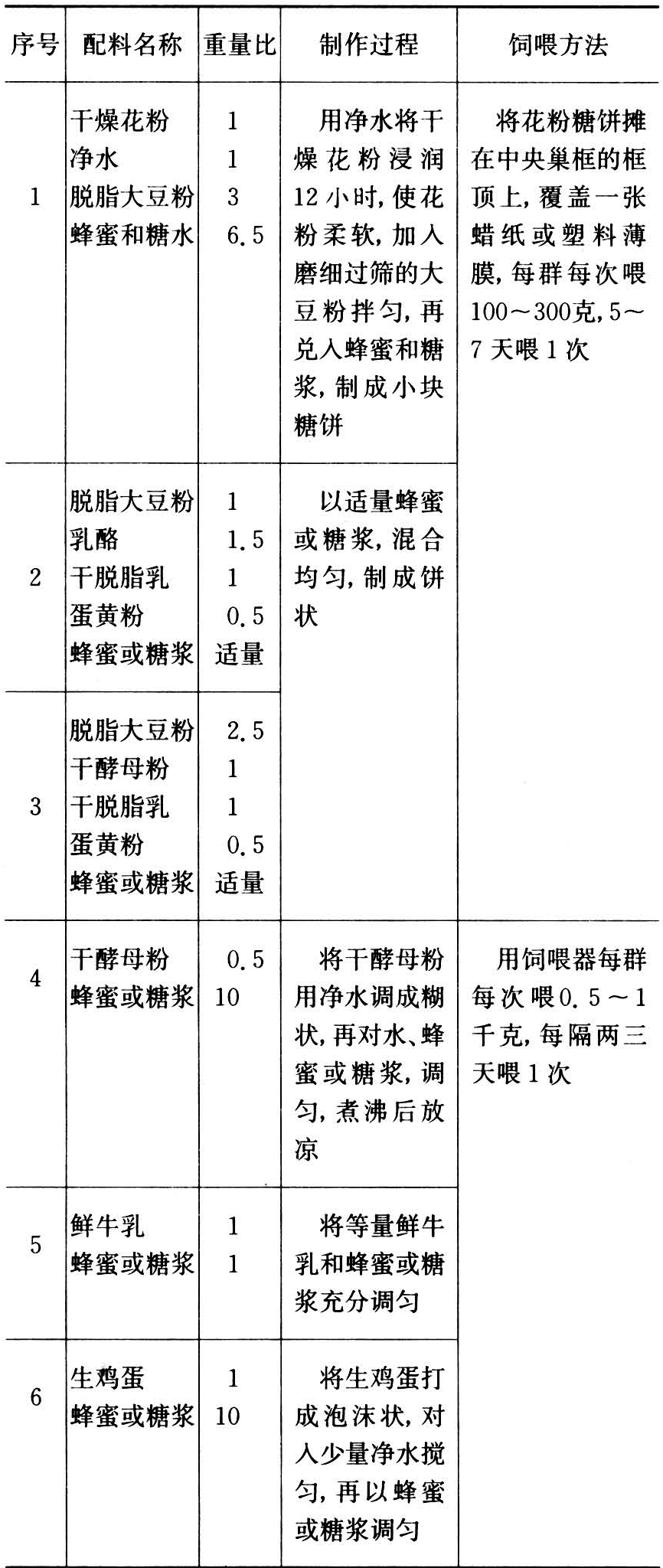 通常用脱脂大豆粉、奶粉、干酵母等加入适量花粉、蜂花粉和糖、蜂蜜等作为花粉的补充物。花粉可用人工采集的玉米花粉、松树花粉或蒲黄花粉等,也可用蜂花粉。使用时,将脱脂大豆粉、干燥的花粉和干糖粉按一定比例调配成粉状饲料,露天置于蜂场内,由蜜蜂自行采集,或者在大豆细粉和花粉中加入糖浆和蜜水,调制成湿饼,置巢内饲喂器里或框梁上,供蜜蜂取食。这种花粉补充物所含的蛋白质、氨基酸、脂类、维生素和矿物质等都是蜜蜂个体生长发育和群体繁殖所需要的,且蜜蜂乐于取用。其中所用的蜂花粉必须取自无病群,贮存时间不超过两年,以防传染疾病。所用的糖以蔗糖为宜,若用蜂蜜,亦应取自无病群。花粉的含量在10~12%时,可增进蜜蜂的适口性;在25~30%时,可增进蜜蜂生命活动所需基础营养物的质和量。