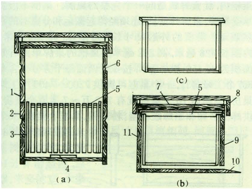巢箱四周板厚25~45毫米,内围尺寸长455毫米,宽455毫米,高330毫米(或450×450×330毫米),呈正方形,箱内容纳12个巢框与两块隔板。框槽宽11毫米,高20毫米。一般不采用铁引条,巢框的框耳直接放在框槽之上。前壁距上沿70毫米处,中央开一直径为25毫米的圆孔,作为上部巢门,用圆木塞启闭。继箱高度为310毫米。巢框外围长435毫米(不计框耳),高300毫米。内围长415毫米,高270毫米。巢框的巢脾单面有效面积为112050平方毫米。在巢箱中,巢框之间的中心距为37.5毫米。