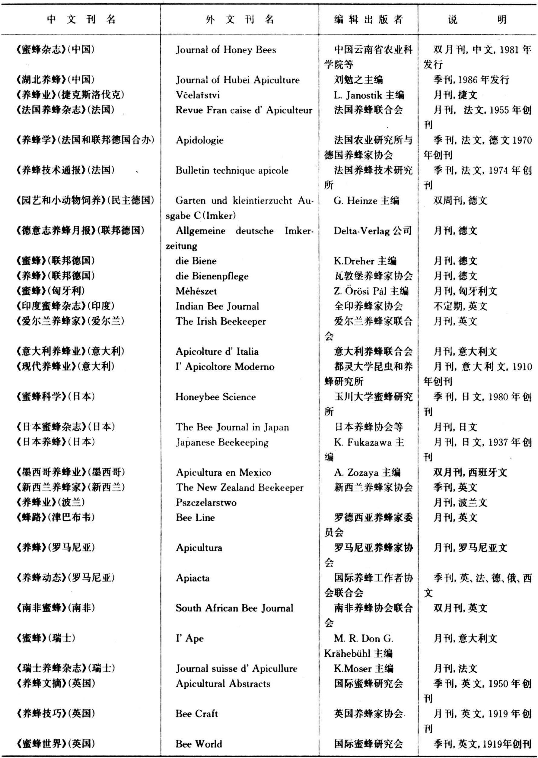 20世纪世界各养蜂先进国家相继出版了养蜂期刊。1980年世界上约有养蜂期刊130种,出版养蜂期刊最多的国家是英国、法国、德国和美国。1988年发行的世界主要养蜂期刊见表。