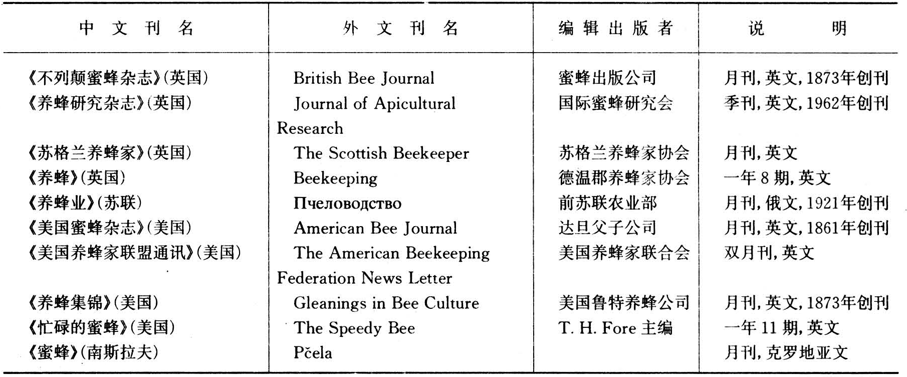 随着现代养蜂业的发展,19世纪中期开始出版养蜂期刊,出版最早的有《美国蜜蜂杂志》(1861)、英国的《不列颠蜜蜂杂志》(1873)和美国的《养蜂集锦》(1873)、俄国的《国外养蜂通报》(1892)等。