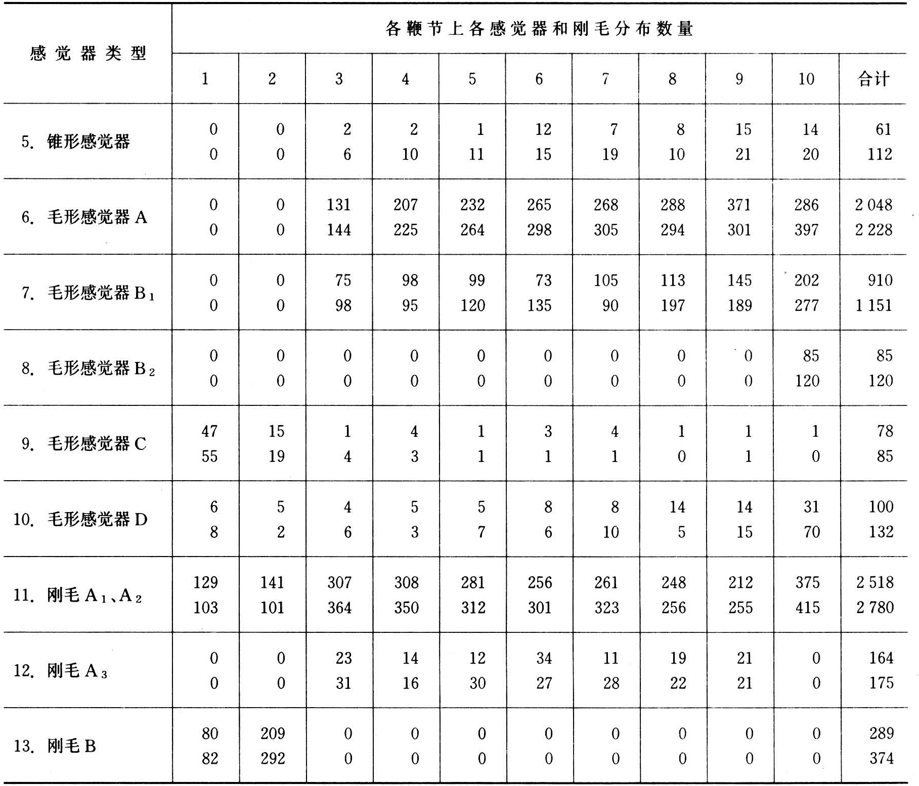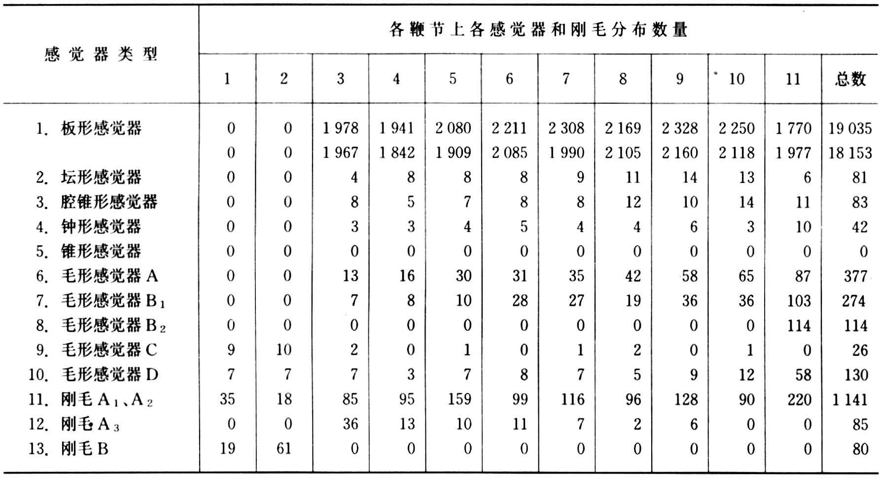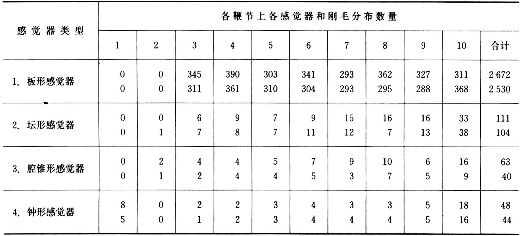 德国J.E.埃辛和美国K.E.凯斯林1976年研究确定的意大利蜂工蜂和雄蜂触角鞭节上感觉器和刚毛的数量见表1和表2。