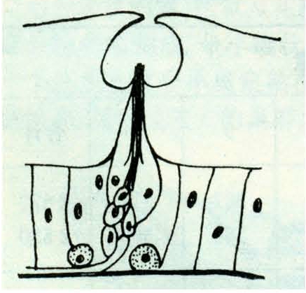 体壁稍凹陷,为一空心锥体,有神经相连。分布于工蜂和雄蜂的鞭节上,其功用为检测压力。(见触觉器官)
