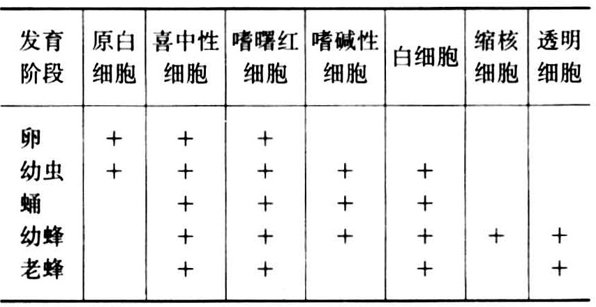长7.0~11.0微米,宽3.5~7.0微米,具喜中性细胞核,老龄蜂为嗜曙红细胞核。细胞质在幼蜂为喜中性,老蜂细胞质透明。透明细胞是血细胞的最后类型,幼蜂体内很少发现。(表1)