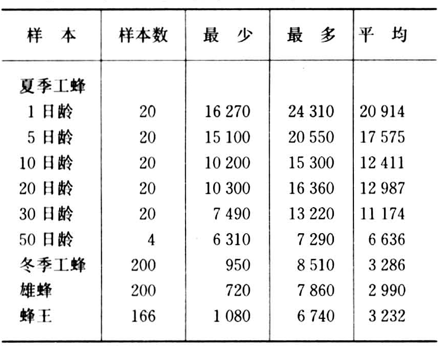 每立方毫米含有的血细胞数因级型和日龄而有差异,并常随生理需要而增减。波兰R.考斯提斯基(1965)指出,1日龄夏季工蜂每立方毫米血淋巴中的血细胞数量最多,平均有20914个;随着日龄增长,血细胞的数量逐步减少。而冬季工蜂,雄蜂和1~3年龄的蜂王每立方毫米血淋巴中的血细胞数量相近似,约有3000个左右。(表2)