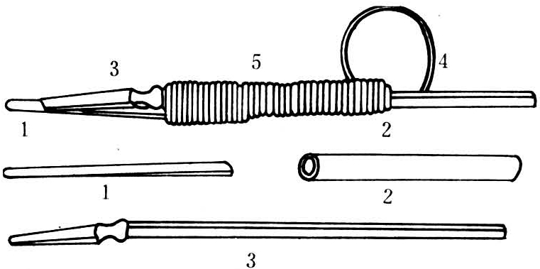 人工育王和王浆生产中用以挑取幼虫的工具。有金属移虫针、鹅毛移虫针、牛角片移虫针和弹性移虫针等。①金属移虫针:用金属丝制成,长约120毫米,一端扁平,呈匙状,与针体成150°角;另一端的105毫米处扁而微尖,薄而光滑,尖端稍向上翘,离尖端12毫米处弯成120°角。②鹅毛移虫针:把鹅毛管柄基部削成舌状并磨薄。也有的用牛角制成。③弹性移虫针:为中国养蜂者20世纪60年代末创制,移虫迅速,不需垫浆。由牛角片舌、塑料管、推杆和弹簧构成(见图)。移虫时,只要将细薄柔软的舌部顺巢房壁伸入房底,就会弯曲并滑入幼虫下面,将幼虫连浆挑起。然后用食指轻压弹性推杆,便可将幼虫连浆推入蜡碗(台基)底部;松开食指,推虫杆在弹簧作用下自动弹回原位。