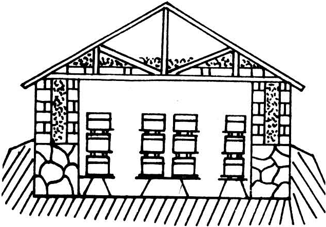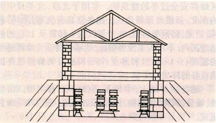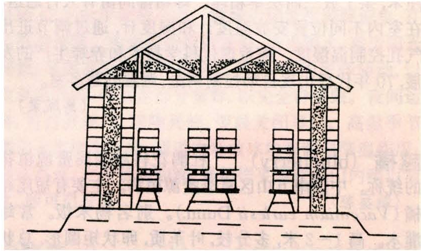 适用于地下水位低的严寒地区。四周是坚固的单层墙壁,天棚上装填保温物,或在上部建有不影响蜂群越冬条件的地上建筑物。进气孔从室门下方或其他部位以管道形式伸入室内各出口。(图3)