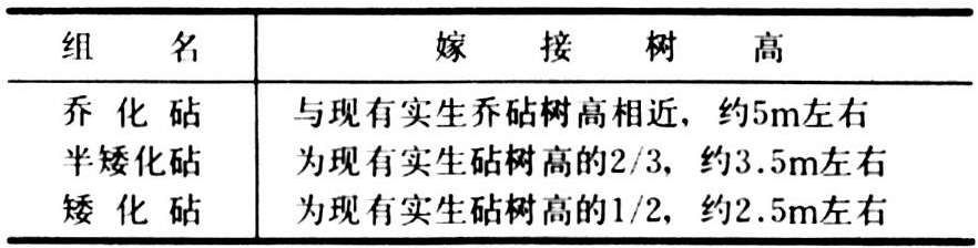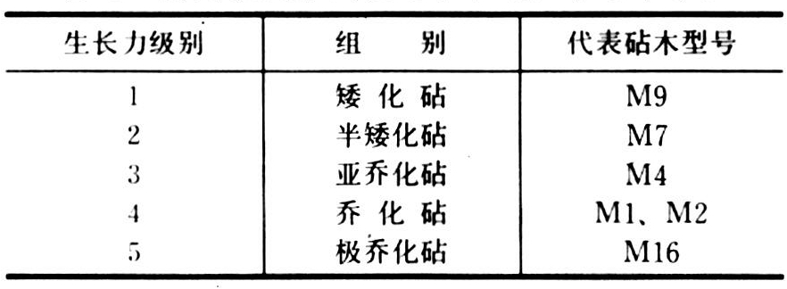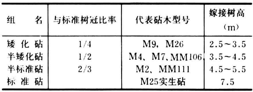 现在苹果生产上应用的矮化砧木都是无性系砧木,与实生乔化砧木上的树冠比较,矮化砧木生长势力的分组情况如下。