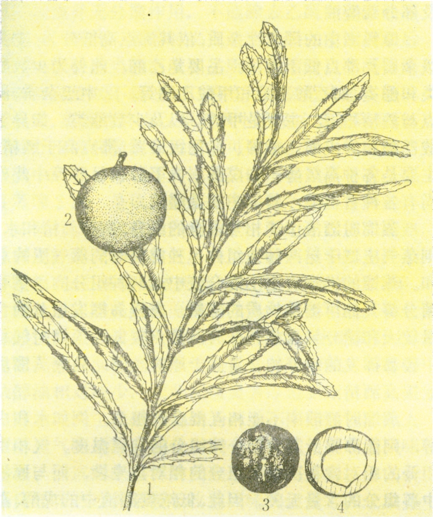 高10~15米。叶3~4片轮生,长12~36厘米,宽2.5~5.5厘米,披针形、革质,光滑,边缘有疏离刺状锯齿。总状花序腋生,花米黄色,花柄长1.5毫米,被毛,花被有毛,长约8毫米。果圆球形,直径约3厘米,果皮革质,内果皮坚硬,种仁米黄色至浅棕色(见图)。
