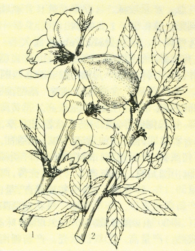 树高4~6米。树干灰黑色。树冠为广圆形,圆形或椭圆形,多开张,冠径3~6米。根系浅,侧根发达。1年生枝淡红褐色,多年生枝灰色或灰褐色。叶披针形或椭圆形,灰绿色,长4~7厘米,宽1.5~3厘米。花玫瑰色或白色;两性花,雄蕊30~36,雌蕊1。果实淡绿色,密生短而细的绒毛;果形有卵形,长卵形、椭圆形或镰刀形;果核扁平,核壳硬,厚薄不一;种仁甜或苦,淡褐色或棕褐色,是供食用部分。