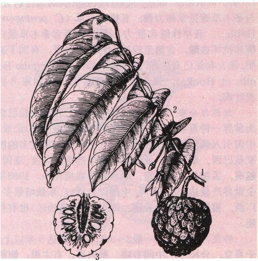 树高3~5米。枝条细软下垂。叶互生,椭圆状披针形,先端短尖或钝,叶背灰绿色,幼时被茸毛,后变秃净。花单生或2~4朵着生于枝端或去年生枝梢叶腋间,青黄色,花瓣6,分内外两轮排列,外轮花瓣狭长而肥厚,肉质,长三棱形,顶端尖,被微毛,内轮花瓣细小,呈鳞片状;雌蕊通常成圆锥或棱锥形突起的雌蕊体;雄蕊多数,轮生于突起的雌蕊群的基部。果实为聚合果,心脏圆锥形或球形,直径5~10厘米,浆果由多数心皮聚合而成,心皮在果面形成瘤状突起,熟时易分离;假种皮为食用部分,乳白色,味极甜,有芳香。种子黑褐色或深褐色,表面光滑,纺锤形、椭圆形或长卵形(见图)。