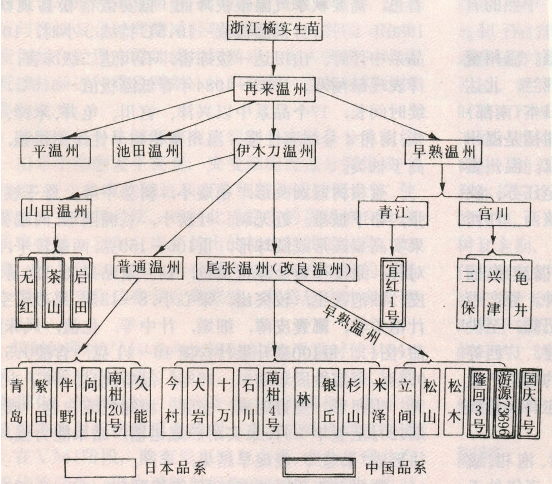 温州蜜柑中最早栽培的品种称再来温州,以后通过芽变、珠心苗选种等途径,由再来温州进一步分化出几个新的品种和品系,即平温州、早熟温州(如青江早生)、池田温州、伊木力温州、尾张温州(又称改良温州),温州蜜柑的品种演变过程(图2)。