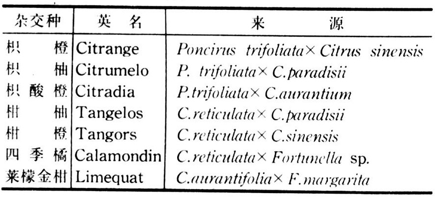 柑橘植物种间容易杂交成功,属间杂交成功的实例也很多。生产上较常见的属间杂交种见表。