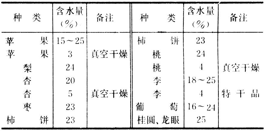 包括自然干制和人工干制两种方法。自然干制是将处理好的果品放在晒盘或其他器皿内晒干,也有晾干,有些要进行堆聚、摊晒等处理。果干的干燥终点含水量随种类品种和加工方法略有差异(见表)。