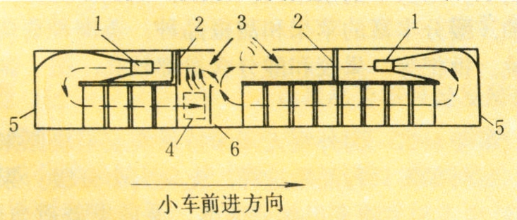 隧道式干燥设备在果品干制中应用最广,凡保持果块形状的果干均可应用。设备主体由干燥隧道、加热部分、通风排湿装置与运载设备构成(图2、图3)。根据设备内气流与干燥物料的走向有顺流式、逆流式和对流式(即顺流与逆流的结合,又称复式或混合流)3种。顺流式干燥车上物料前进方向与干热空气流动方向一致,果品首先接触为高温低湿热空气,果品升温快、干燥速度大,随干燥进行,进入低温高湿环境,最终干燥终点不易控制低水分含量,适用于水分含量高的果品。逆流式干燥果品从低温高湿介质走向高温低湿介质,终点含水量低,适于大部分果品。对流式干燥结合了顺流和逆流干燥的优点,克服了各自的缺点。