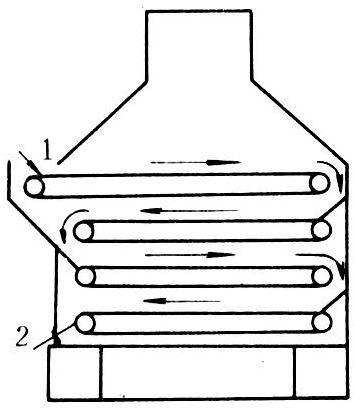 连续输送带式干制机中物料在输送带中运行,输送带的设计为多层形式,使各层的物料在转换中可翻动。整个机械用蒸汽加热,安装于每层传送带之间,新鲜空气由底部进入,湿气由上部出口排出,适用于连续生产(图4)。
