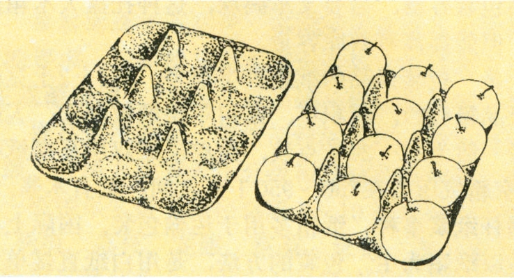 为了避免或减轻果品散放在外包装内相互碰压磨伤,常采用单果包纸或多果装塑料小袋,或用托盘或分层隔板、分格定位装果的方法。内包装种类很多,可以是印有商标的,质地较轻软的白纸,泡沫塑料网袋等,也可以是纸浆托盘(图1)或瓦楞纸隔板或格子板。