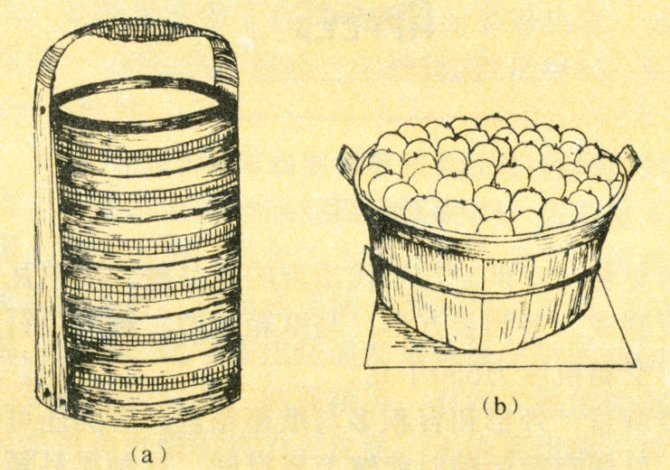 一般用竹片或木板制成。中国有盛水蜜桃的蒸笼提篮,欧美有装苹果的旧式果篮(图2),容量一般为20~30千克。