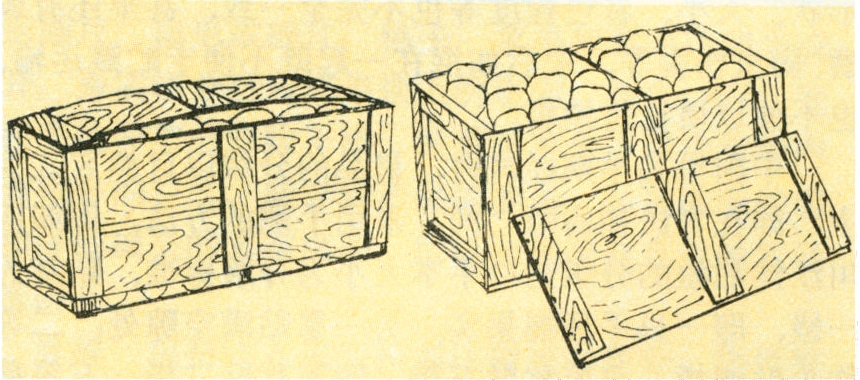 用无异味的木板制成。中国主要用于苹果、梨、桃等果品的贮藏和运输包装,容量一般20~25千克。其优点是结实耐用,在贮藏中可码高垛。作为贮、运包装并可以重复使用多次(图3)。中国用木箱装果品时,一般手工操作封装。过去,国外装木箱是靠铁丝捆木箱的自动封箱机,现在已少用。目前,多数采用托盘大木箱,系用2~3厘米厚的木板制成,容量400千克,主要用于从田间采收运至冷库、气调库或包装厂的果品包装容器,需要叉车码垛,这种托盘大木箱造价高,但能提高有效库容量。